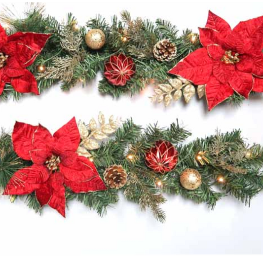 Battery Operated 180cm Red Poinsettia Pre Lit Garland With 25 LEDs with Timer