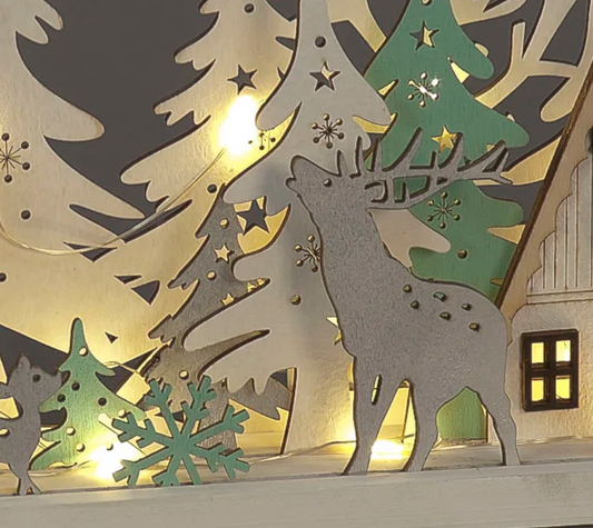 Battery Operated 16cm Wooden House with Trees, Deer & Children