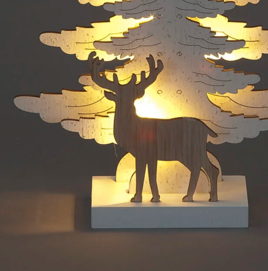 Battery Operated 25cm White Wood Xmas Trees with Natural Wood Deer & 5 Warm White LEDs