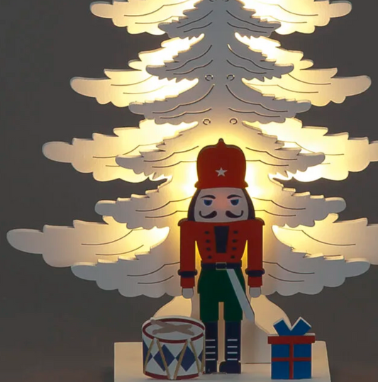 Battery Operated 25cm White Wood Xmas Trees with Nutcracker Soldier & 5 Warm White LEDs