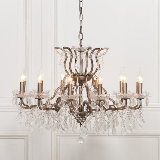 Antiqued Silver 12 Branch Shallow Cut Glass Chandelier