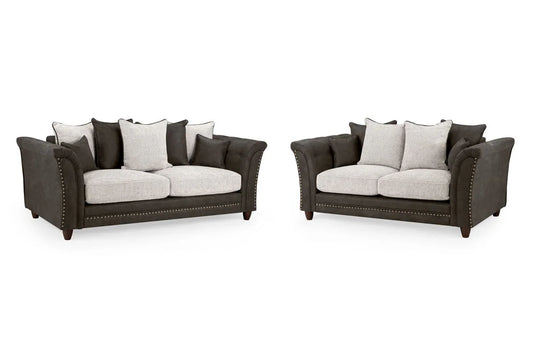 Discover timeless elegance with the Balmoral Sofa Collection by Heritage Sofa Co., offering versatile seating options including large corner, 3-seater, 2-seater, armchair, or a 3+2 set deal and a footstool is also available. Choose between scatter back or full back designs, all upholstered in a sophisticated contrast of dark grey, hard-wearing faux leather and light grey polyester fabric, accented with a plush velvet and chenille finish. Featuring removable cushions with button-tufted detailing and a stylish scatter back design, these sofas combine comfort, durability, and refined style, perfect for creating a welcoming and luxurious living space.