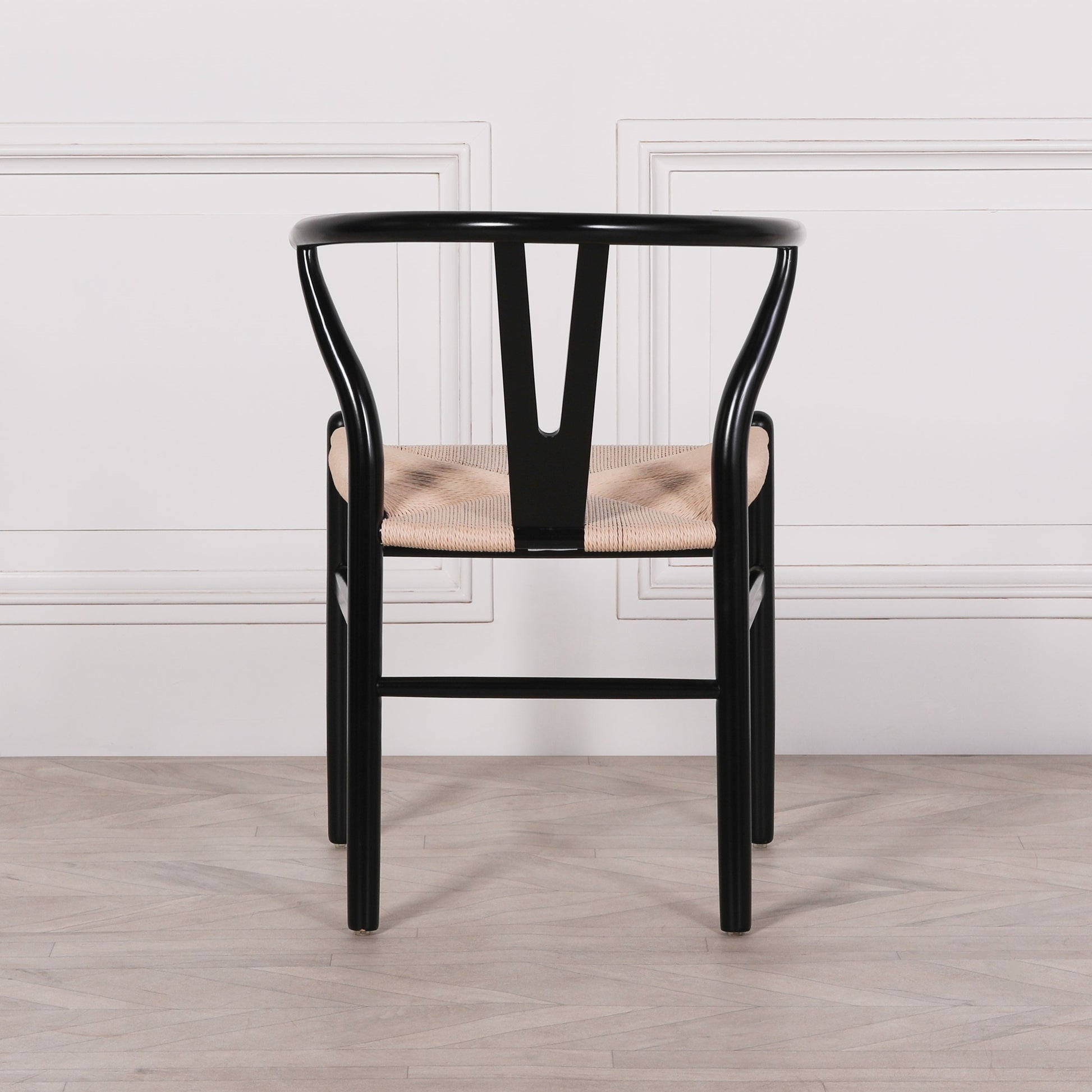 Complementing the table are four Wishbone-style dining chairs, painted in the same black finish, with gently curved backs and woven seats that offer both comfort and style. The combination of the detailed columned base, rustic tabletop, and matching chairs creates a harmonious aesthetic that is both timeless and contemporary, perfect for those seeking a statement piece that exudes craftsmanship and rustic elegance.