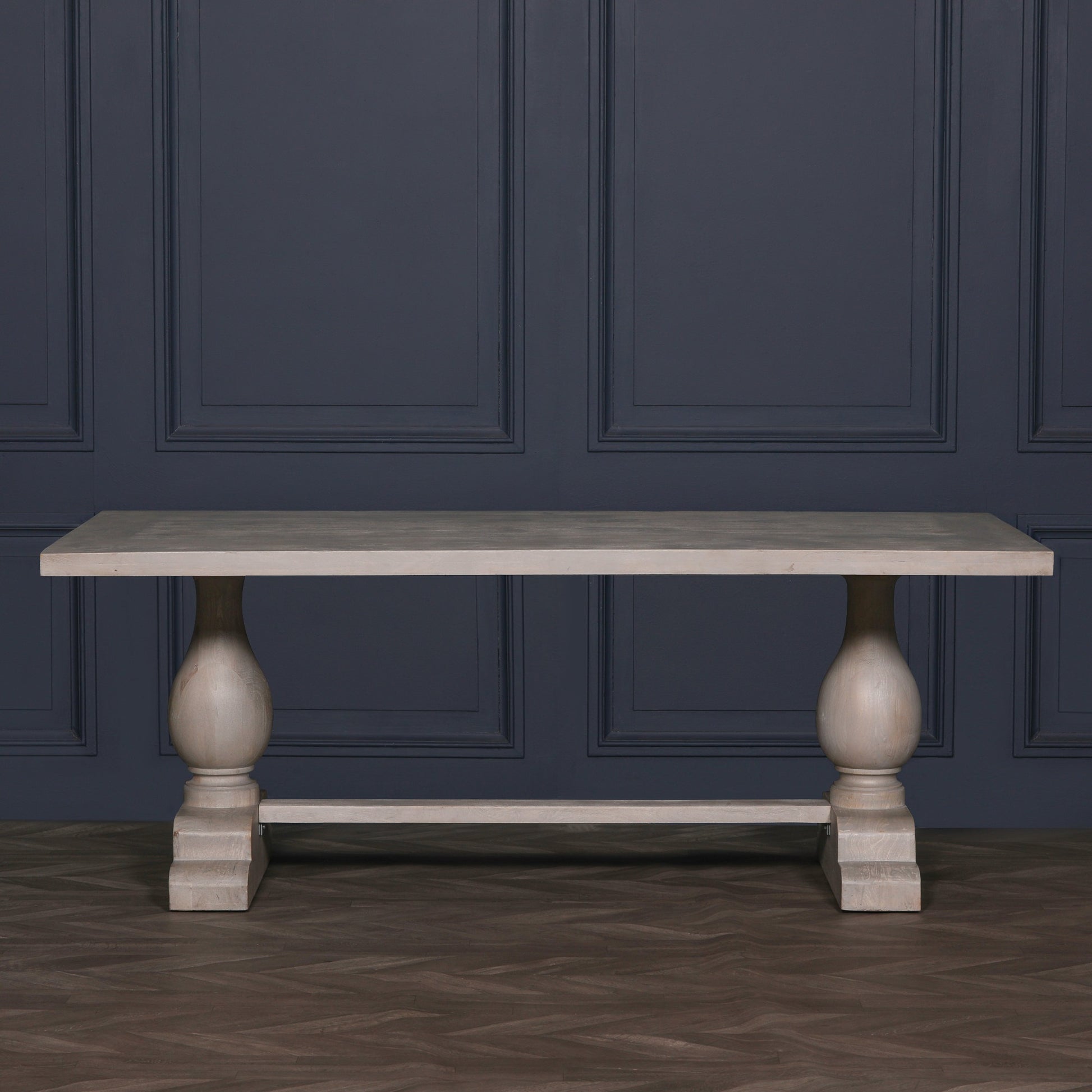 The Blanche Wood Rustic Washed Rectangular Dining Table, measuring 210cm, is a beautifully handcrafted piece that exudes rustic charm and artisanal craftsmanship. Made from high-quality Blanche mango wood, it features a light grey rustic wash finish that highlights the natural grain and texture of the wood, giving it a weathered, vintage appeal.