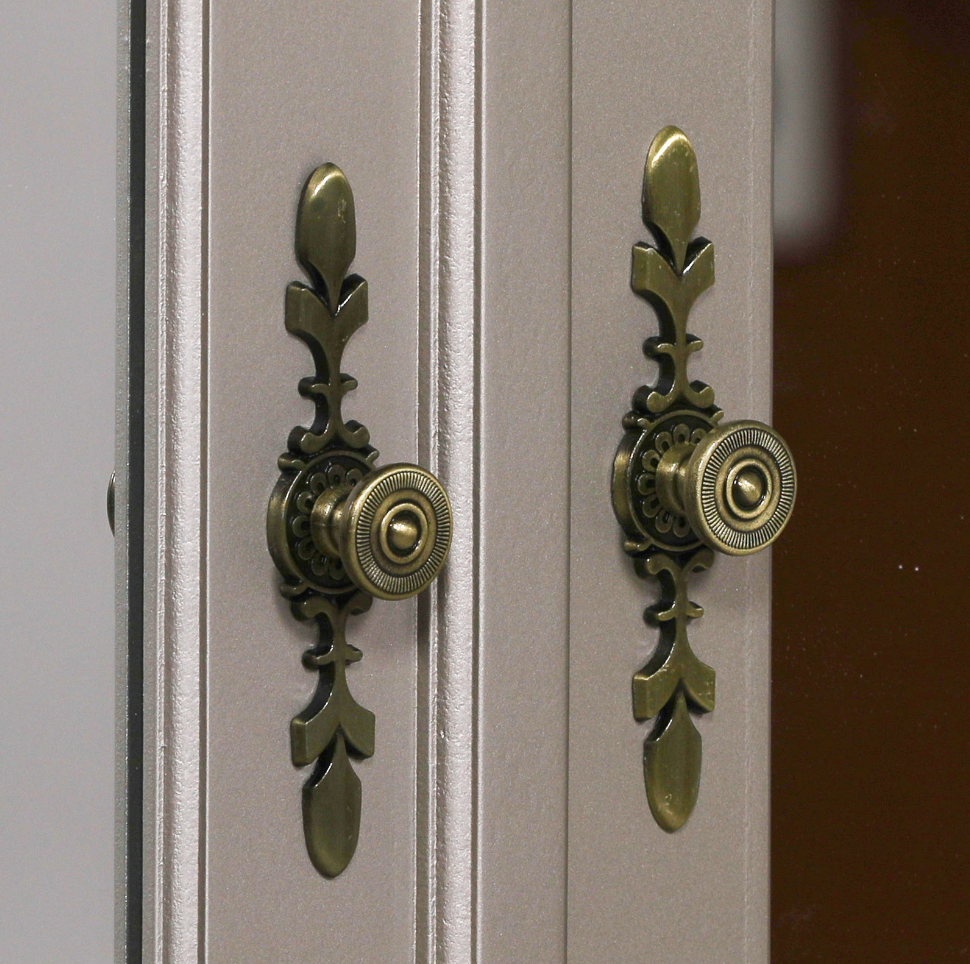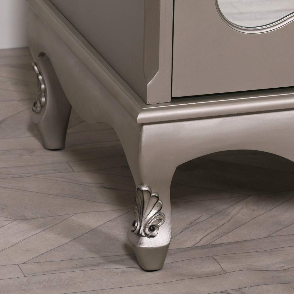 Silver double wardrobe in a French antique style featuring detailed motif crown and legs with full length mirrored doors. The internal features include a hanging pole and removable shelf inside.