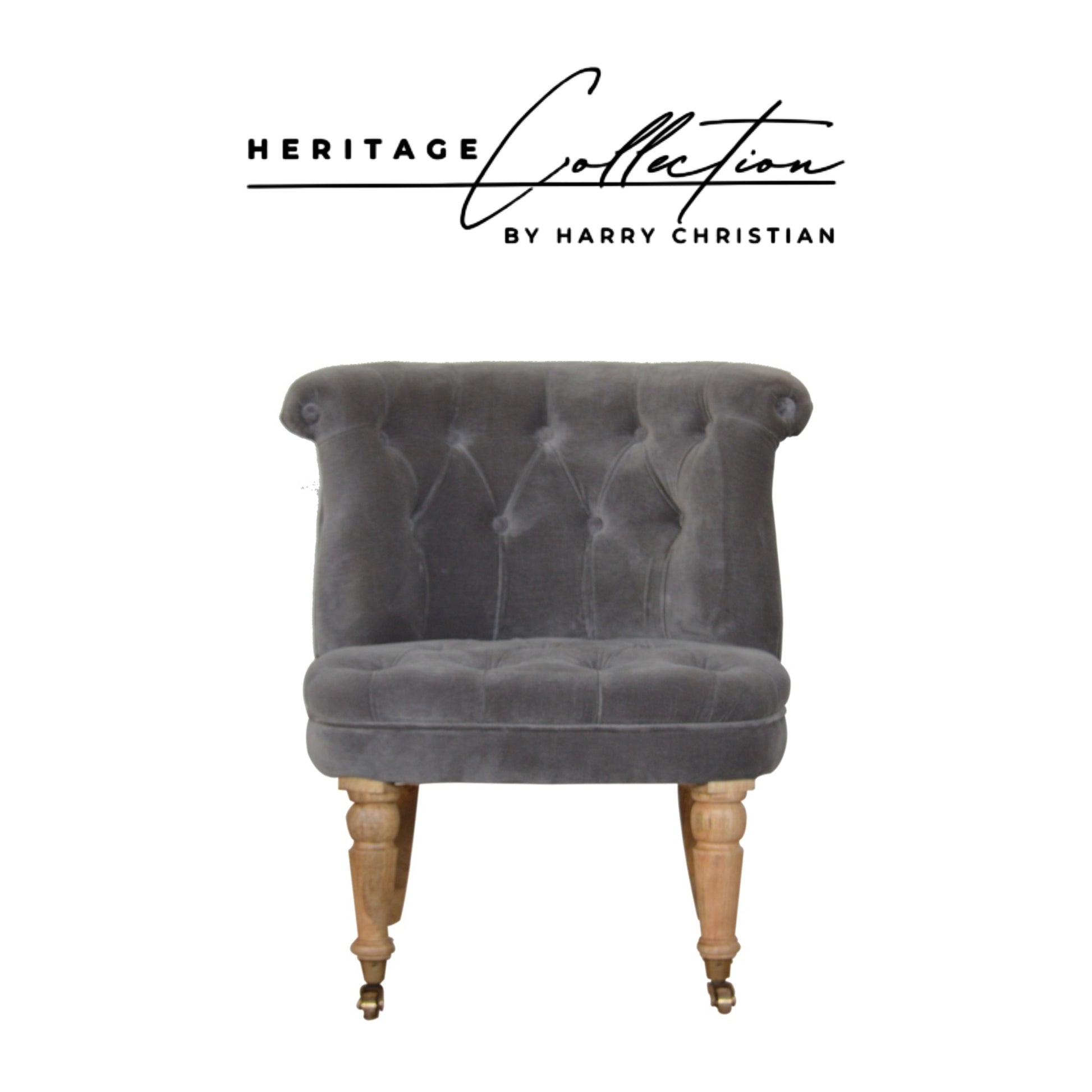 The Grey Velvet Accent Chair, a distinguished piece from the Heritage Collection by Harry Christian, exemplifies exquisite craftsmanship and timeless elegance, designed to elevate any interior space. This petite yet striking accent chair is meticulously hand carved from 100% solid mango wood, showcasing intricate detailing that highlights the artisanal skill and natural beauty of the wood. Upholstered in soft, luxurious grey cotton velvet, it offers a refined texture that exudes sophistication while providing a cozy, inviting seating option. The deep button tufting on the backrest enhances its classic charm and adds visual depth, making it a versatile statement piece. Its construction features two caster legs at the front, offering mobility and a contemporary touch, paired with two tapered legs at the back, all finished with a subtle oak-like hue that adds warmth and character. The harmonious blend of traditional craftsmanship, modern design elements, and neutral tones makes this accent chair a perfect addition to a variety of decor styles, from modern minimalist to classic eclectic. Whether placed in a living room, bedroom, or entryway, it introduces an extra layer of character and definition, enriching your home’s aesthetic. Compact yet impactful, the Grey Velvet Accent Chair by Harry Christian seamlessly combines elegance, comfort, and artisanal quality, making it an essential piece to bring sophisticated charm and personality to your living space.