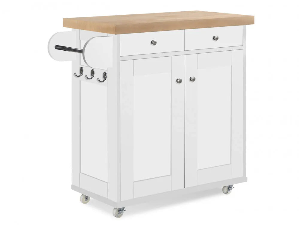 Add a touch of modern style to your kitchen with the Heritage Kitchen Island, available in sleek grey, black, or white finishes, paired with a warm solid oak top. This practical and versatile kitchen island provides additional counter space and storage, perfect for families who need extra room to cook, prepare, and entertain. With its spacious double cupboard, two drawers, and towel holder with handy hooks, this island offers ample storage and organisation for your kitchen essentials. The Portland Kitchen Island is an affordable and portable solution to your kitchen needs, featuring silver accessories and a modern contemporary design that will complement any kitchen style.