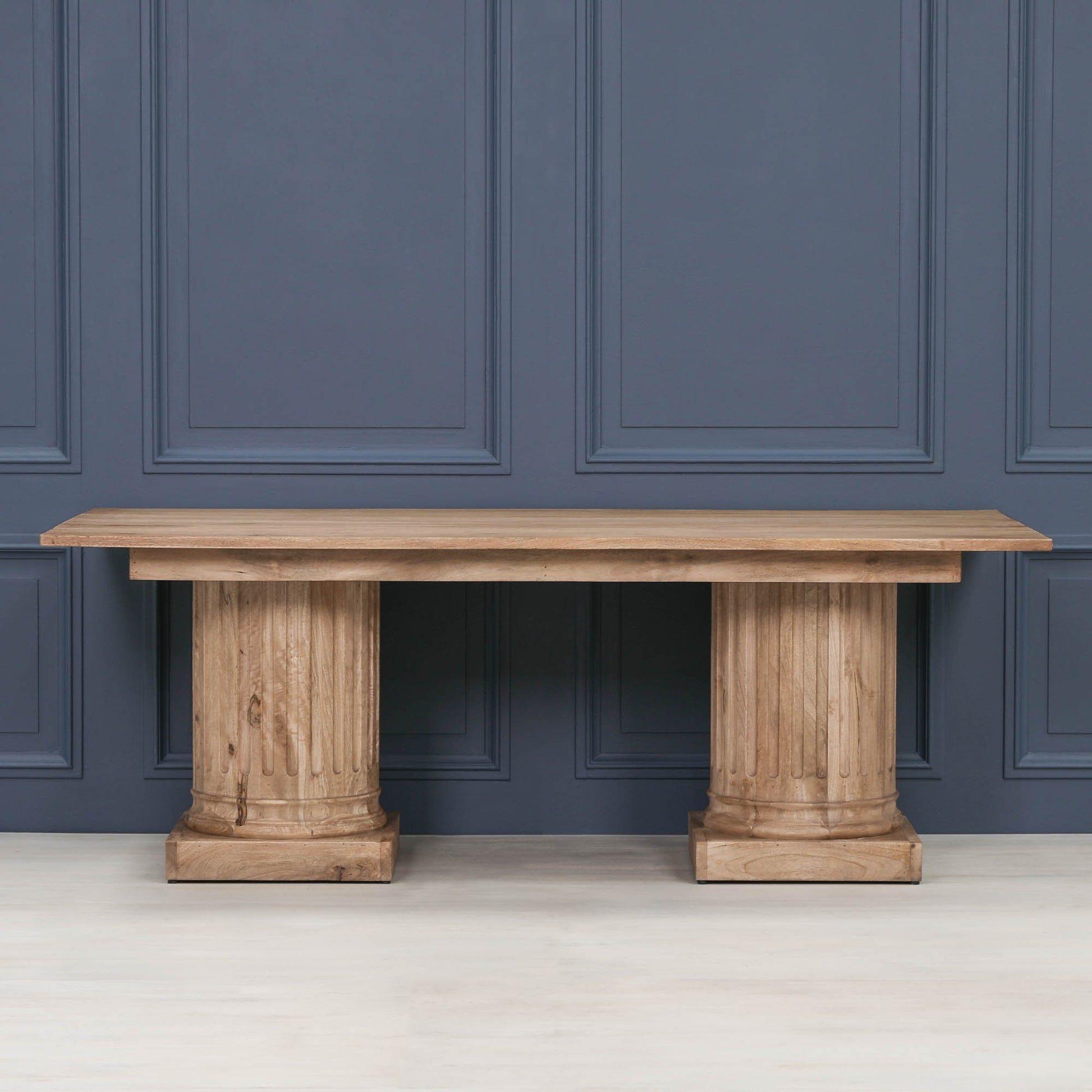 The Wooden Column Rectangular Dining Table, measuring 220cm, is a beautifully crafted piece that combines sturdy construction with elegant design. Featuring a robust rectangular tabletop supported by a distinctive columned base, the table showcases classic craftsmanship with a focus on durability and aesthetic appeal. Its warm wood finish enhances the natural grain and texture of the material, adding a timeless, inviting charm to any dining area. Designed to comfortably seat six, this table is perfect for family meals and gatherings, offering ample space and stability.