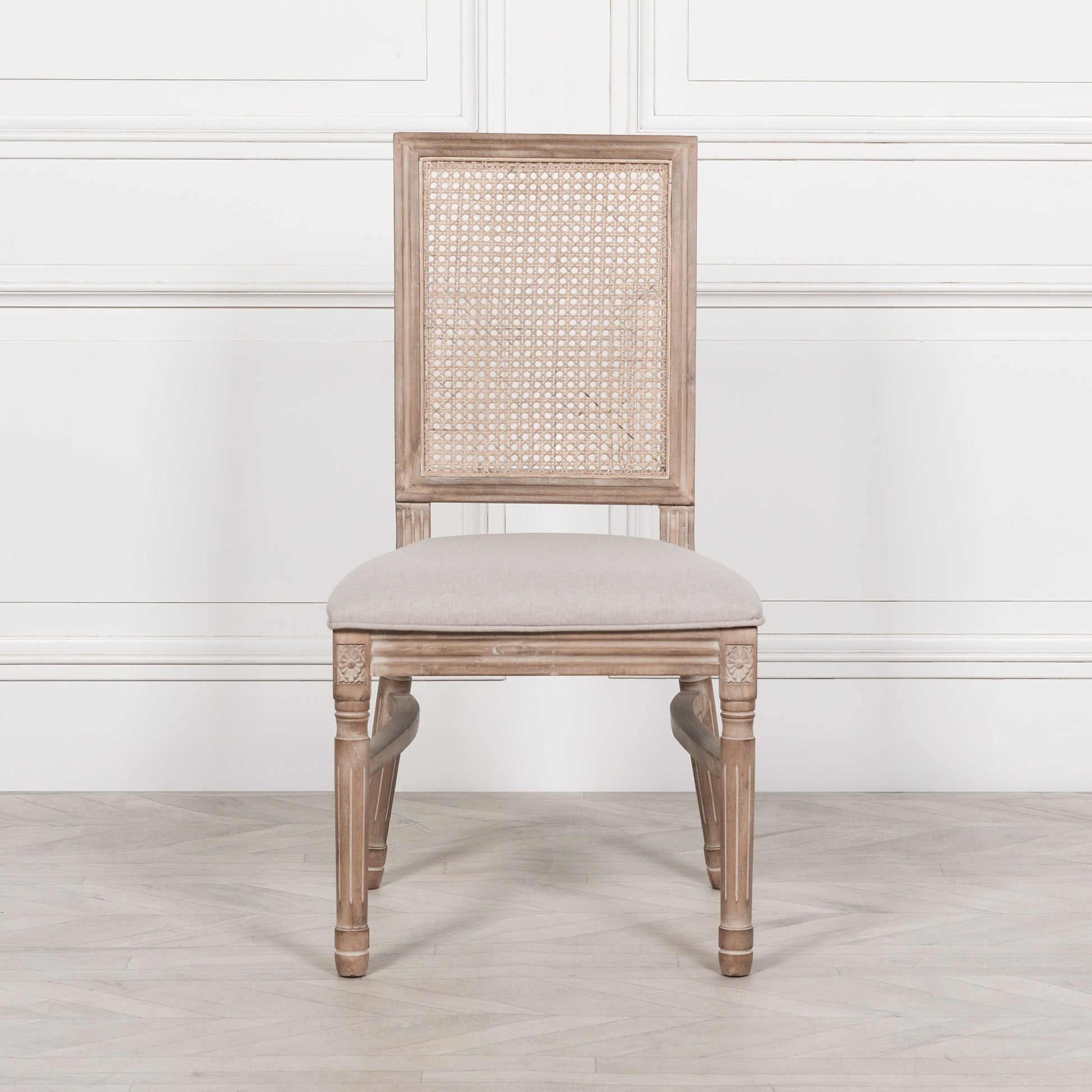 Complementing the table are six Louis Square Backed Chairs, which feature a distinctive square-backed design, plush upholstery, and a refined silhouette. The combination of the solid wooden table with the stylish Louis chairs creates a balanced aesthetic that merges traditional elegance with contemporary comfort, making it an ideal centre piece for both casual and formal dining settings.